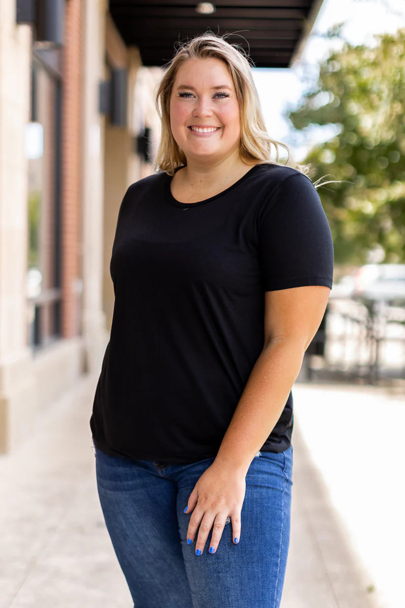 The Black Crewneck Tee is a wardrobe essential that combines simplicity and versatility. Soft. Stretchy. Crew Neck. Straight Bottom Hem. Longer Sleeves. This has a slightly slimmer fit than the boyfriend tee.