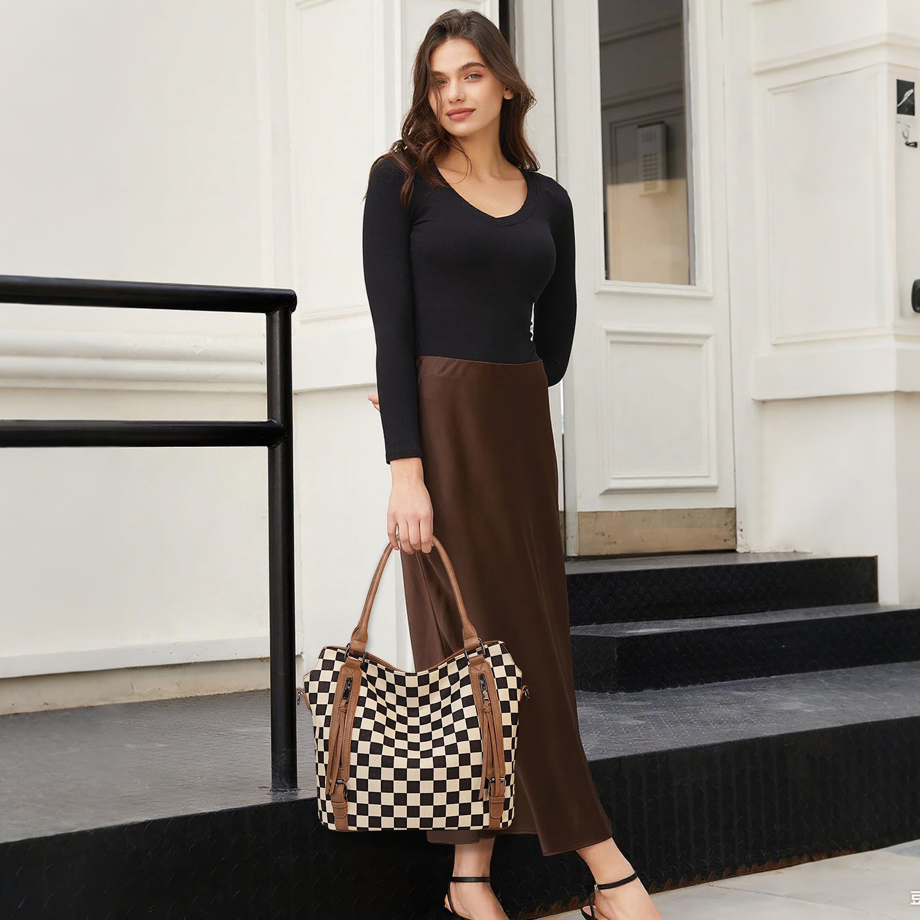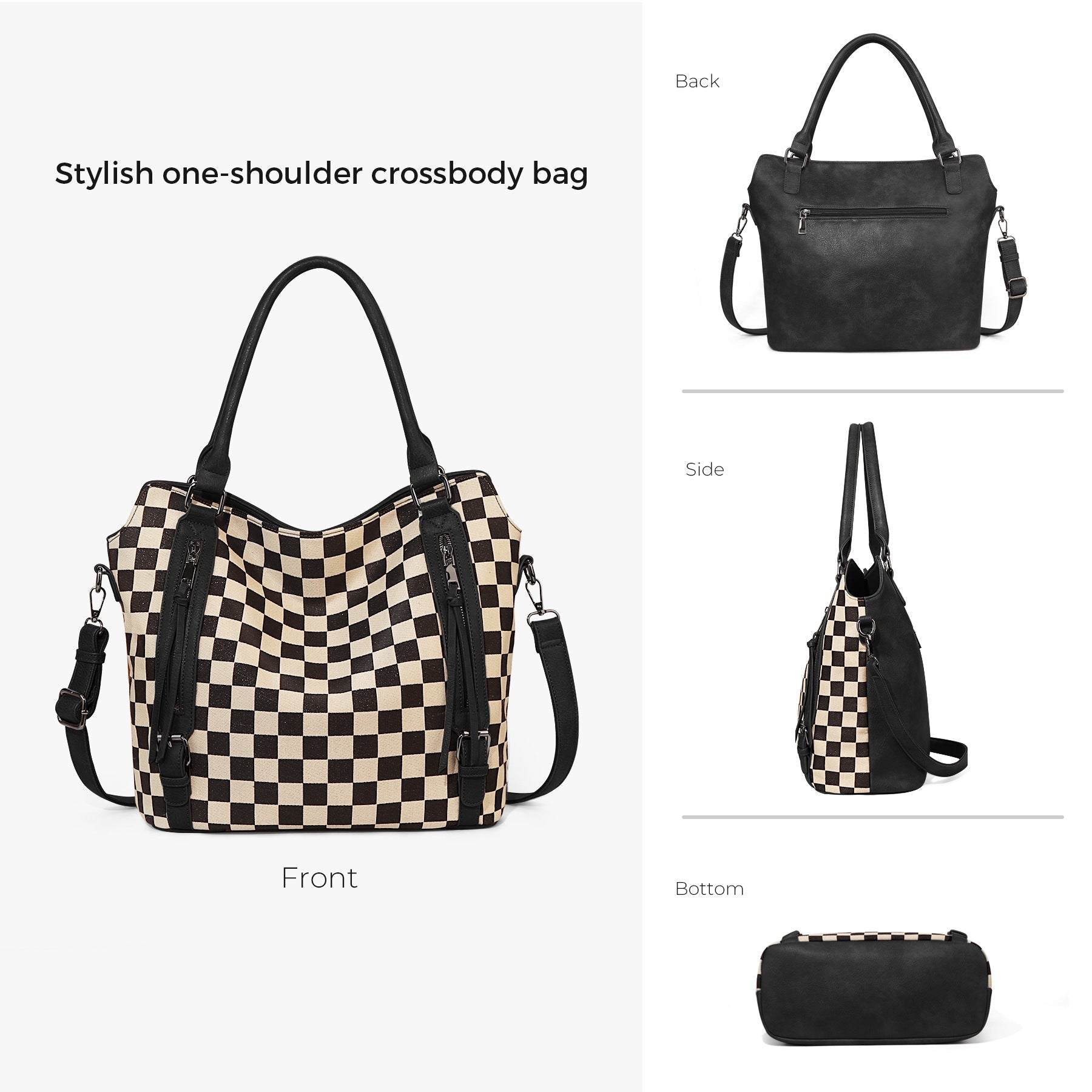 This spacious Tote measures 16.92" wide and 12.79" tall, giving you room for everything from daily essentials to weekend getaways. The classic checkered pattern pairs perfectly with the included matching wristlet for on-the-go convenience. Featuring an adjustable strap, detachable buckle for customization, and a secure back zippered pocket, this duo keeps your belongings organized and accessible. Large capacity means you'll never leave anything behind. The ultimate two-in-one set for the modern woman who refuses to compromise on style or function.