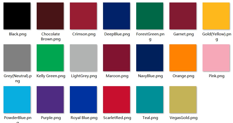 TEXT COLORS TO CHOOSE FROM: BLACK, CHOCOLATE BROWN, CRIMSON, DEEP BLUE, FOREST GREEN. GARNET, GOLD/YELLOW, GRAY, KELLY GREEN, LIGHT GRAY, MAROON, NAVY BLUE, ORANGE, PINK, POWDER BLUE, PURPLE, ROYAL BLUE, SCARLETRED, TEAL, VEGAS GOLD