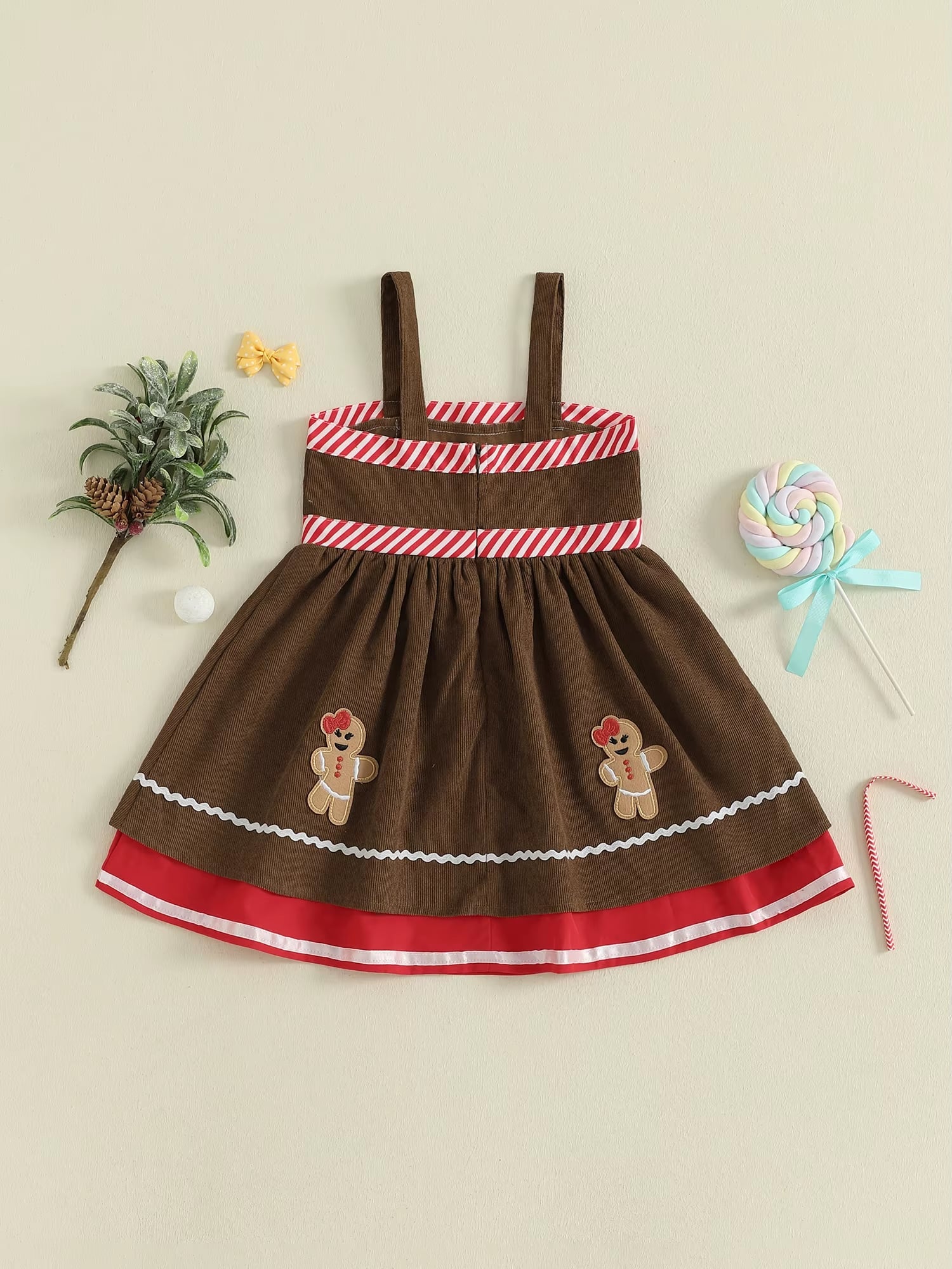 This playful Gingerbread Girl dress features two adorable gingerbread girls with bows on their heads, perfect for festive fun. Candy cane stripes frame the top and waist, accented with three charming buttons to complete the look. Ideal for bringing sweet holiday cheer to any celebration.