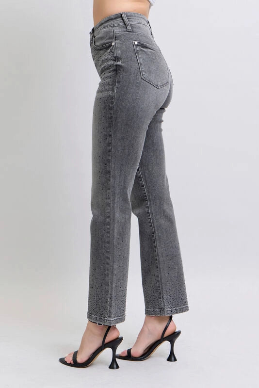 Elevate your style with our HW Rhinestone Straight jeans from Judy Blue. These contemporary, ankle-length jeans are perfect for the fall/winter season, featuring a beaded detail that adds a touch of sparkle to your outfit. The solid gray color and straight cut offer a chic, modern look while the 92% Cotton, 7% Polyester, 1% Spandex blend ensures comfort and durability. With a front rise of 11" and an inseam of 30 1/2", these jeans are ideal for a day party or a bachelorette bash, adding a touch of glam to any ensemble. Remember to hand wash to maintain their quality and sparkle. 88919