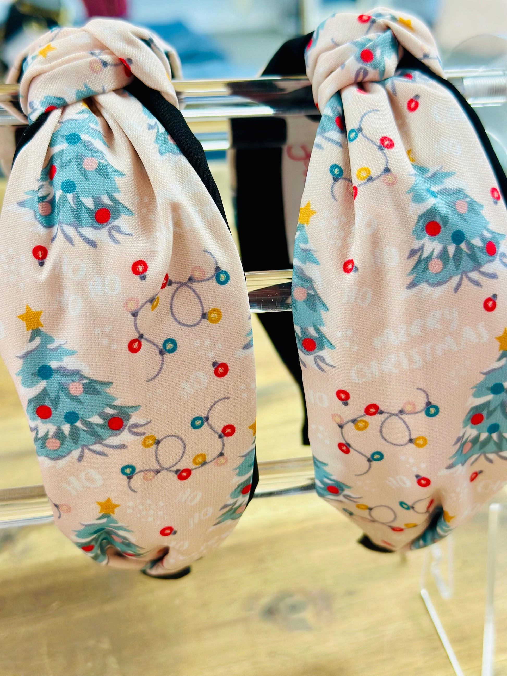 This Neutral Christmas Headband is the ideal accessory to spread holiday joy! Adorned with a neutral pattern of Christmas trees, lights, and a "ho, ho, ho" motif, this festive headband is sure to make you smile and keep your holiday spirit shining.