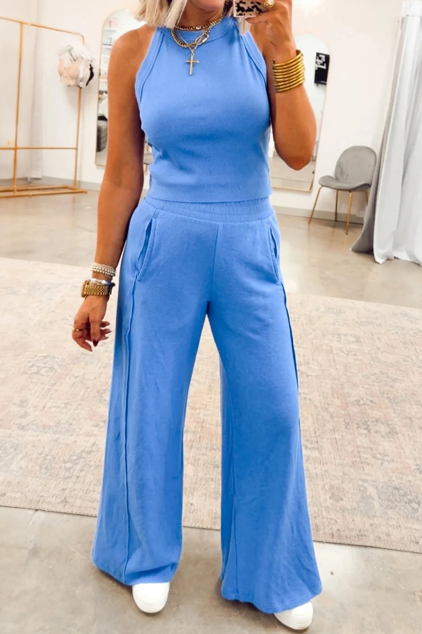 Here's your go-to combo that's equal parts comfy and chic. This two-piece pairs a sleeveless top with matching pants in a premium fabric blend. It moves with you all day long. Choose from three gorgeous colors and find your perfect fit across four sizes. Whether you're lounging, running errands, or stepping out, this set delivers effortless style without compromising on comfort. Elevate your wardrobe with this High quality set.