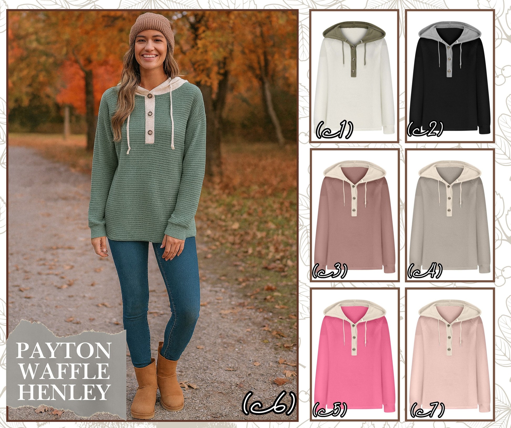 Stay cozy and cute in the Payton Waffle Henley! This long-sleeve women's top features a waffle knit, a hood with playful ties, and a flirty 3-button front. Available in 7 cheerful colors and 6 sizes, it’s perfect for layering or lounging with style. Snag yours for cooler days ahead!