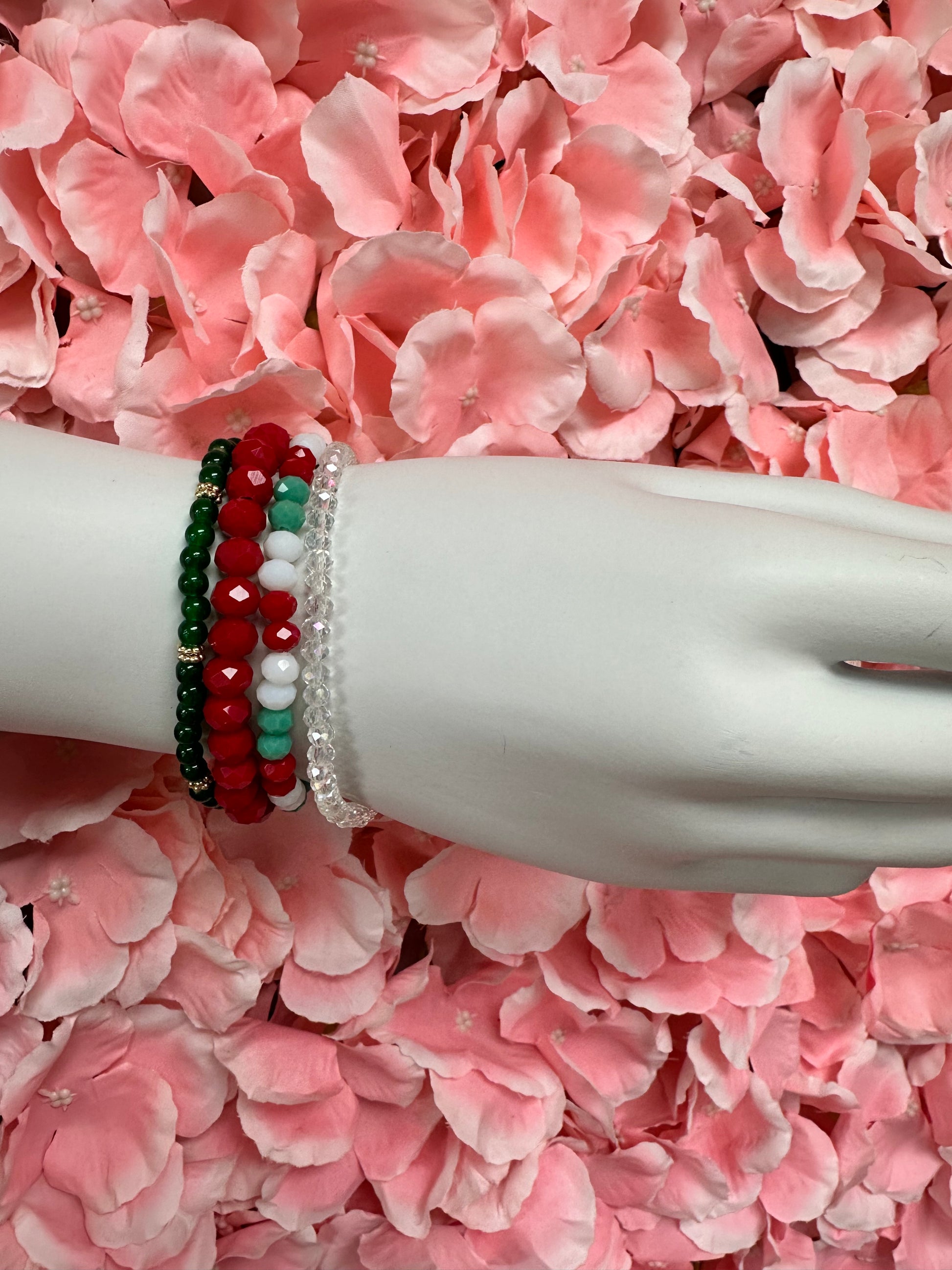 This bracelet set has 4 strands of beads in different shapes and sizes, with beads mixed in. You can stretch it on for the perfect fit.