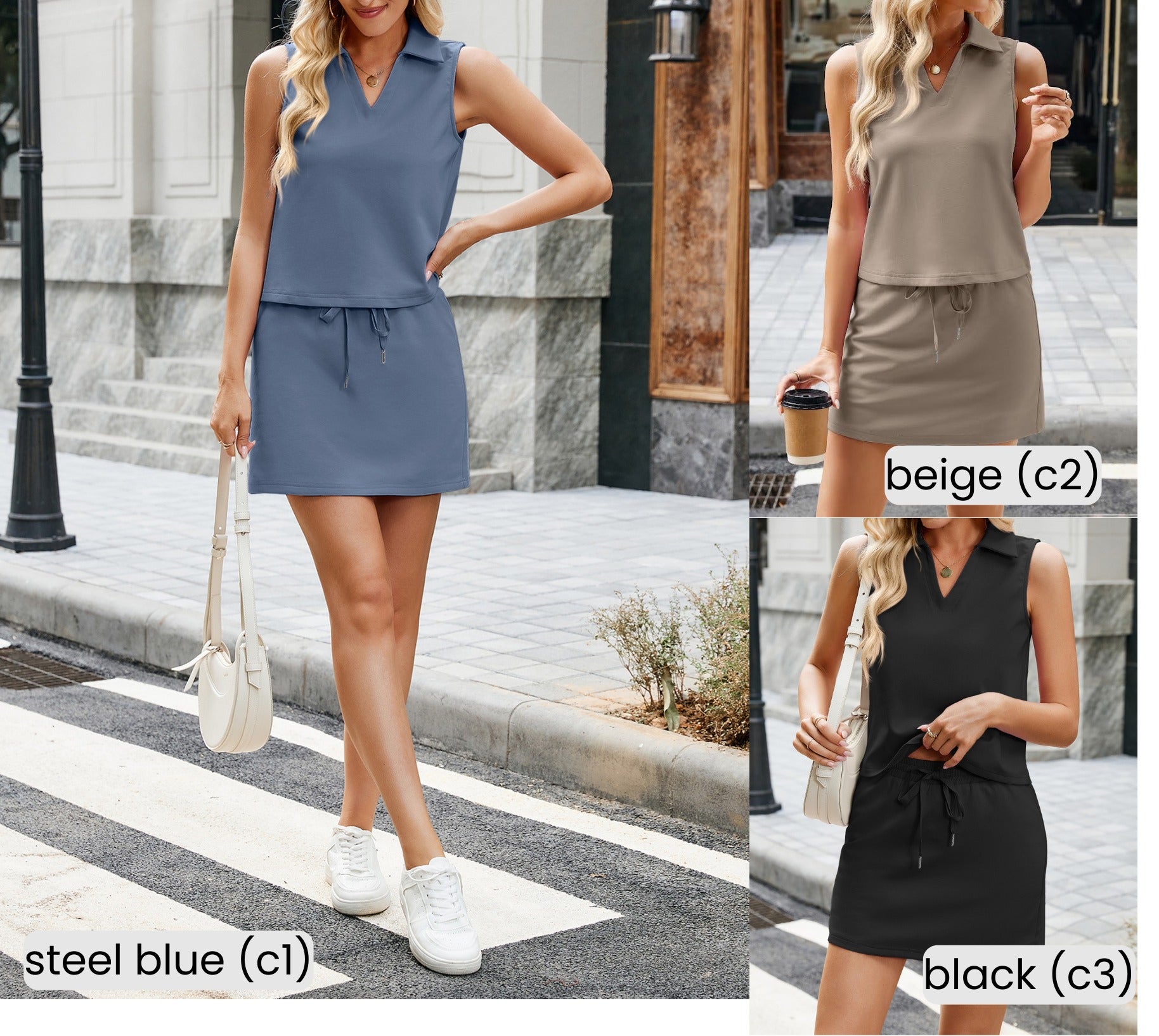 The Society set is here to make stretching and strutting equally fabulous. This breezy two-piece features a V-neck top with a sharp collar and short sleeves, paired with tie-waist skort that let you dial in the perfect fit. The fabric blend—55% viscose, 40% polyester, 5% elastane—keeps things breathable and bouncy. And those hidden pockets? They're basically magic.
