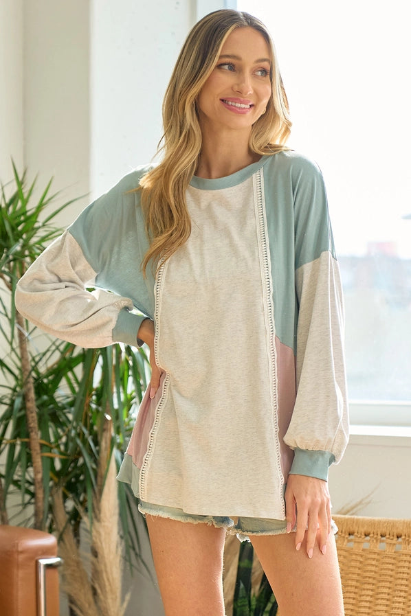 Effortless charm meets everyday comfort in our Sunday Stroll Colorblock Pullover. This dreamy lightweight top features soft tones of sage, blush, and oatmeal, creating the perfect blend of cozy and chic. Designed with relaxed balloon sleeves, delicate seam detailing, and a loose, easy silhouette — it’s the ultimate throw-on piece for coffee dates, errands, or lounging in style.