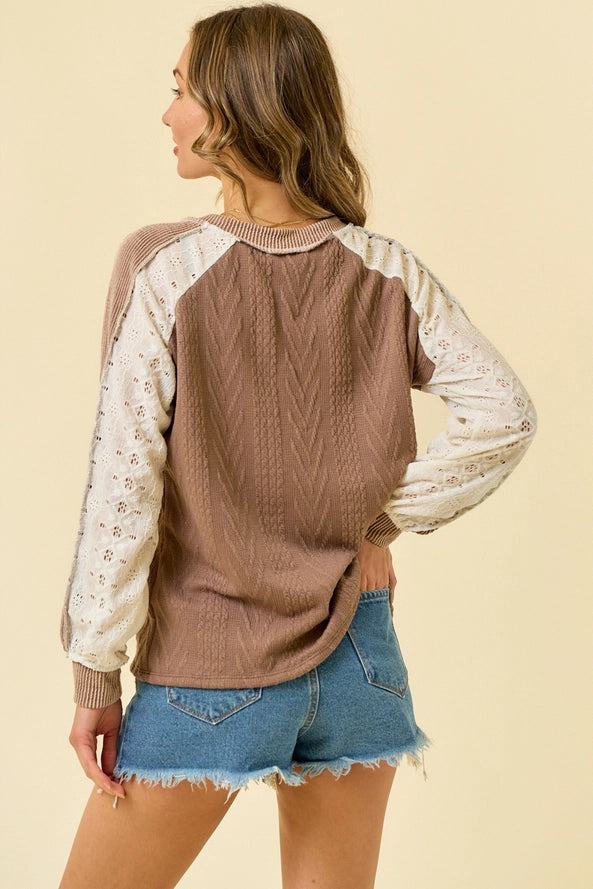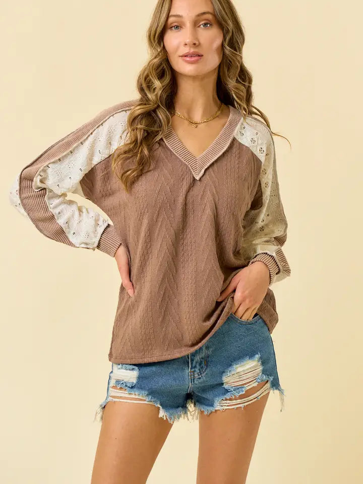 The Grace in layers cable knit top is made of a poly span material. Features a banded v neckline, has long sleeves with cuffed sleeves, with a lace contrast detail.