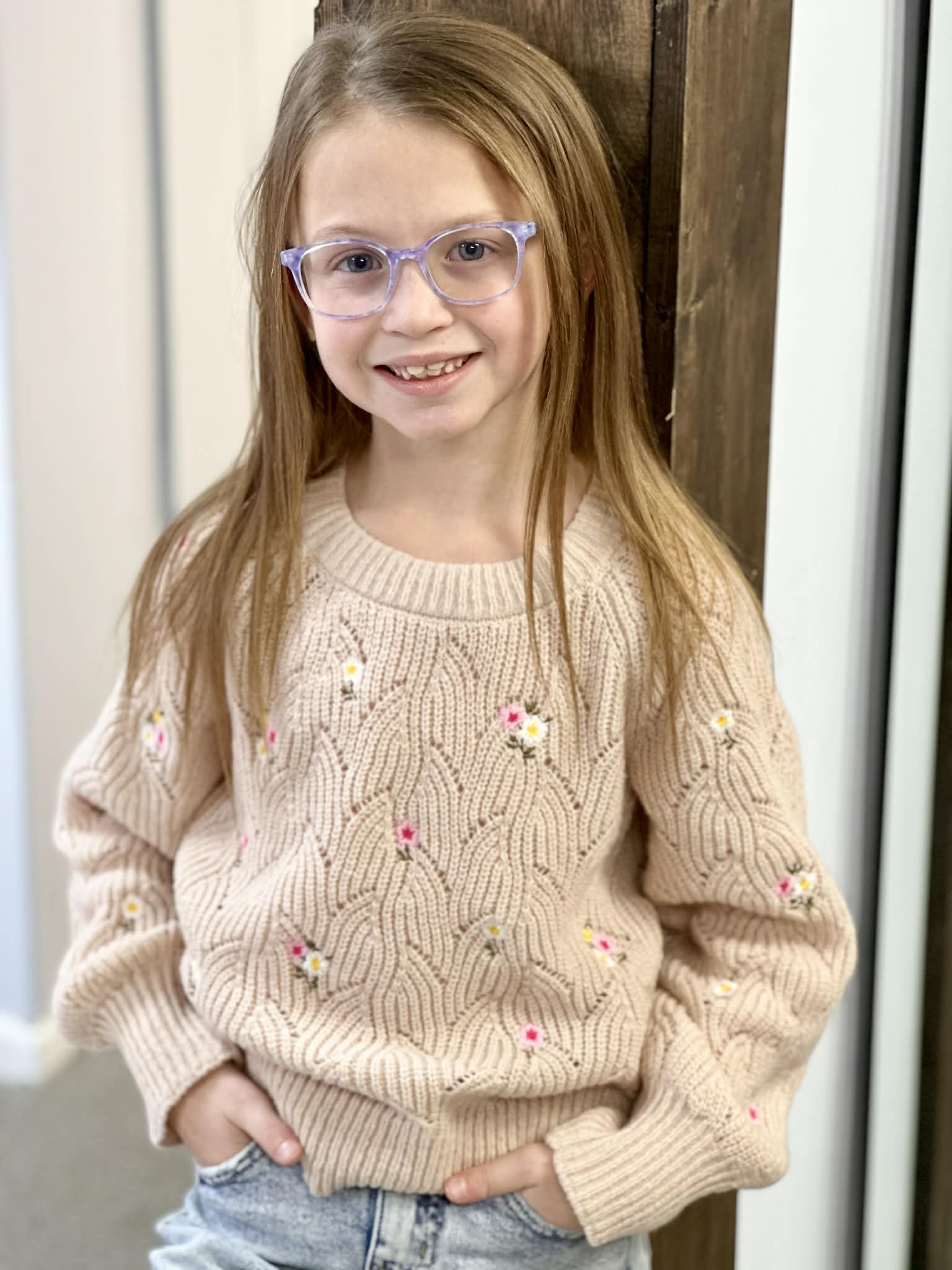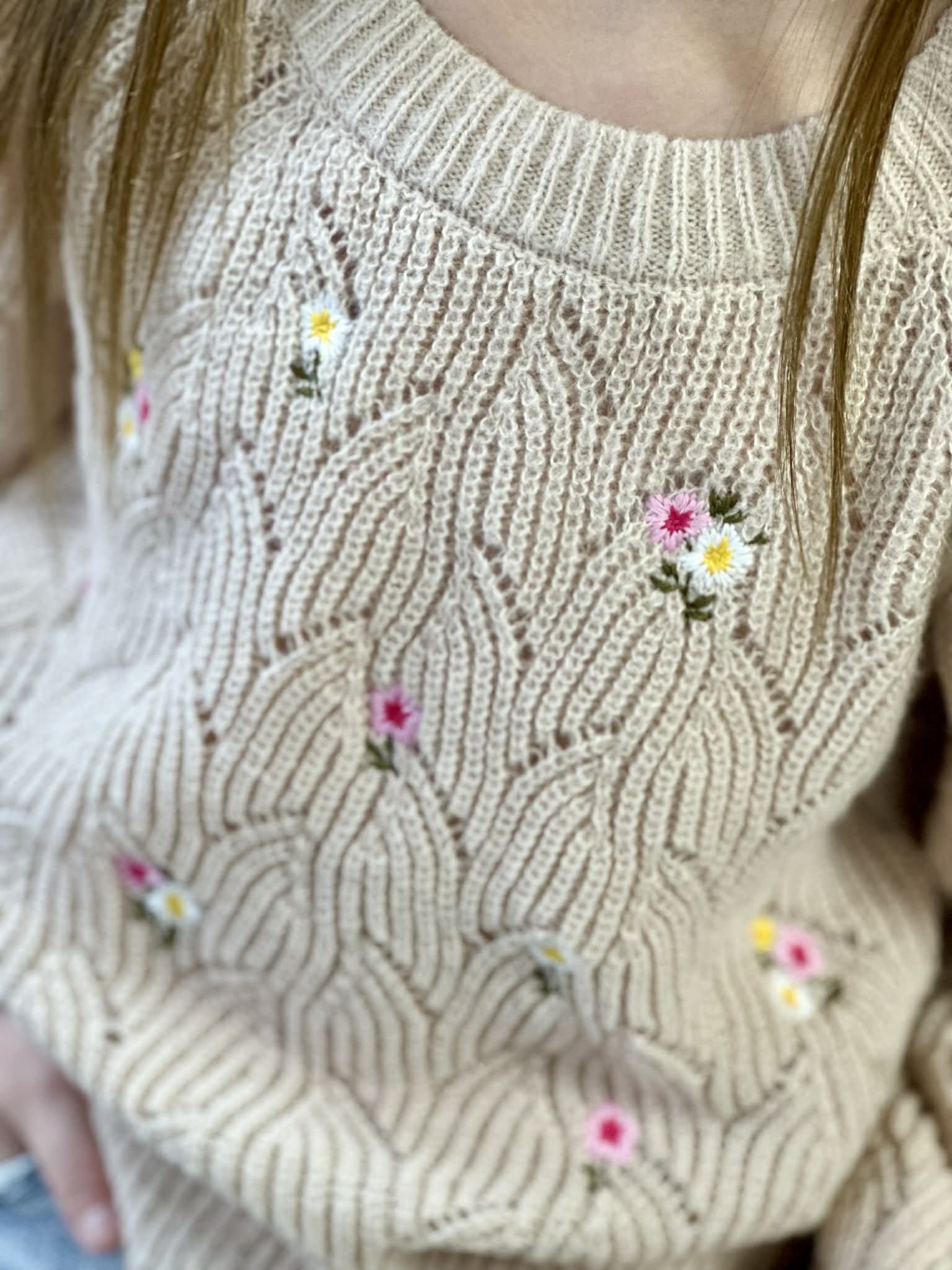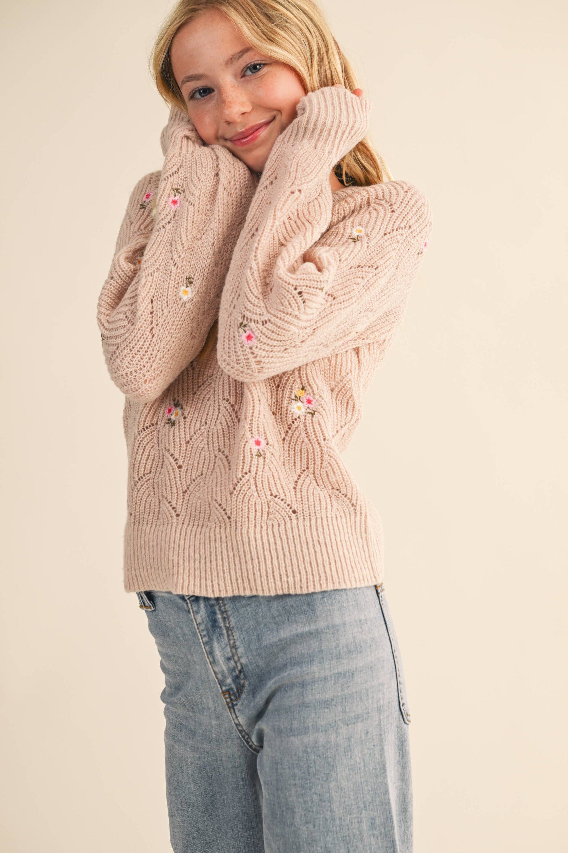 Sweet and sophisticated, this embroidered floral pointelle sweater is a charming addition to her fall and winter wardrobe. Made in a warm natural beige hue, the sweater features a delicate pointelle knit pattern with playful texture and breathability. Scattered with dainty floral embroidery in soft pink and white, it brings a touch of whimsy and elegance to any outfit. The ribbed cuffs, hem, and neckline ensure a snug, comfortable fit, while the relaxed silhouette makes it perfect for layering over tees or pairing with jeans.
