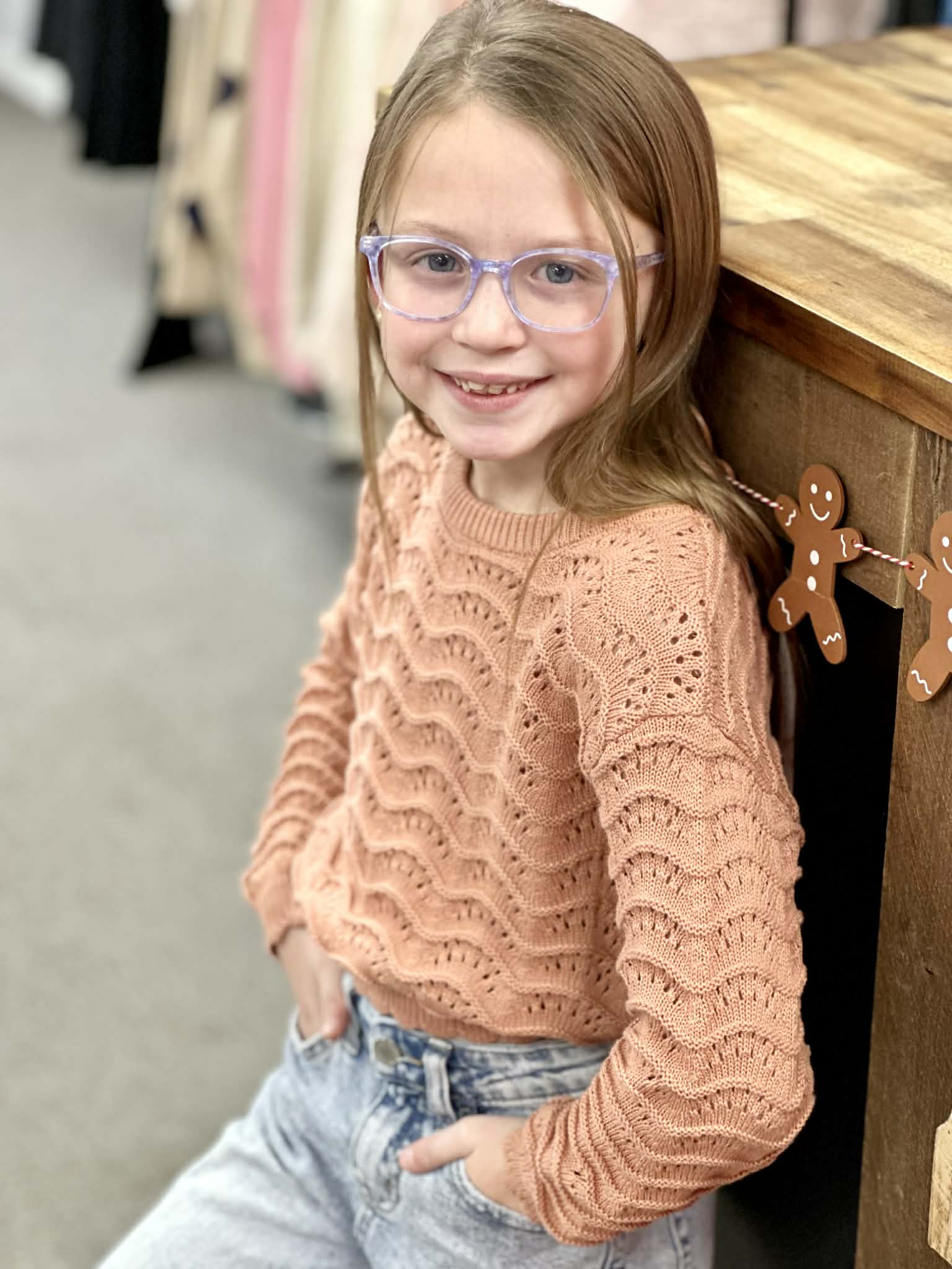 The relaxed, slightly cropped silhouette pairs perfectly with high-waisted denim for an easy, put-together look. Finished with ribbed accents at the neckline, cuffs, and hem, this piece blends comfort with timeless charm.