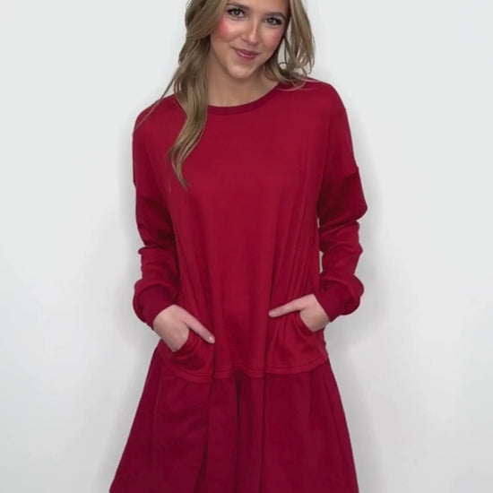 Meet your new effortless show-stopper. This stunning drop-waist dress features a rich, deep red hue and a soft, comfortable knit that drapes beautifully on every body. The relaxed long sleeves and flowy ruffle hem add a touch of feminine charm, making it the perfect blend of cozy and chic.