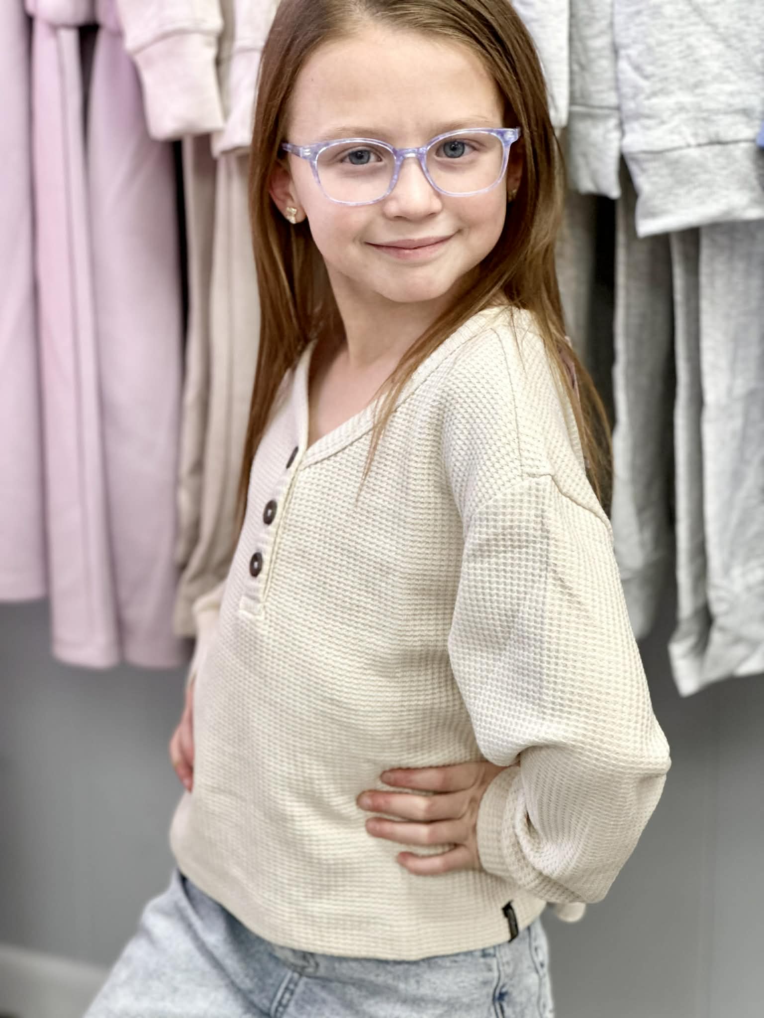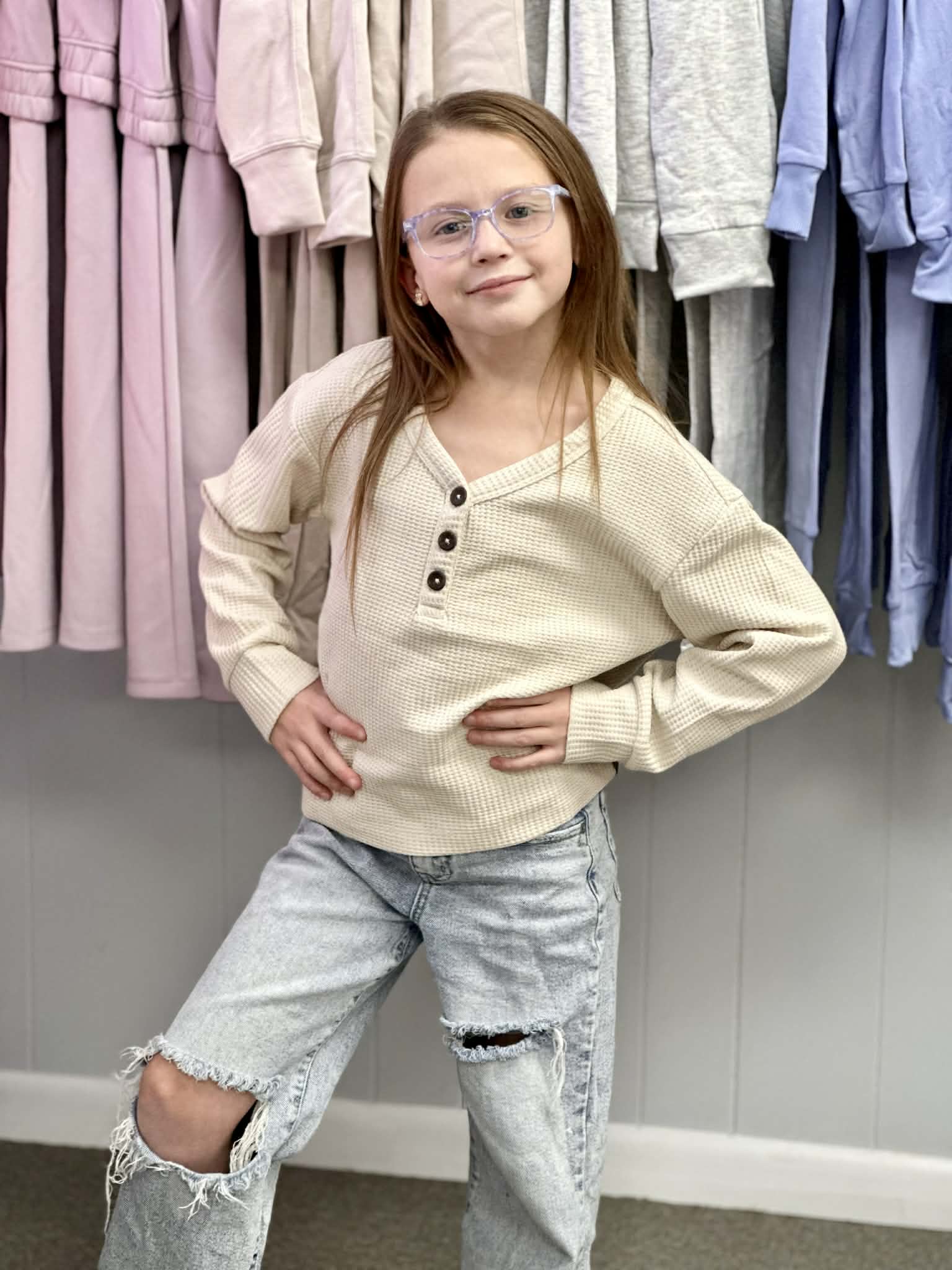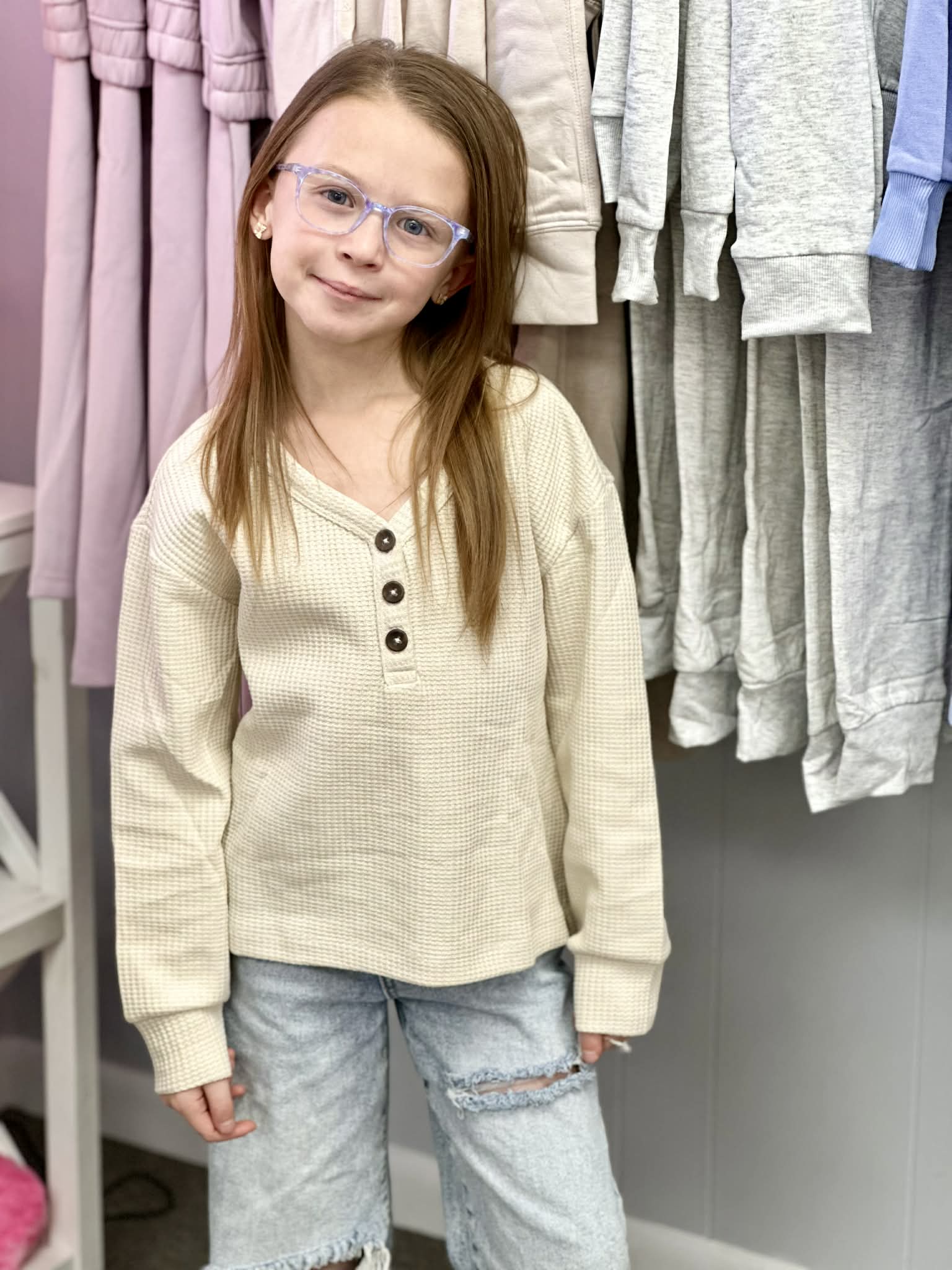 Stay cozy in style with this super soft thermal knit Henley, designed for comfort and effortless layering. Featuring a relaxed fit with dropped shoulders, this top has a laid-back, easygoing feel. The waffle knit texture provides warmth and softness, while the three-button front placket adds a classic Henley touch. Instead of traditional ribbed cuffs, this design features double-layered self-fabric cuffs, enhancing the cozy fit while keeping the look sleek and modern. Whether paired with jeans or leggings, this top is a versatile essential for any casual wardrobe.